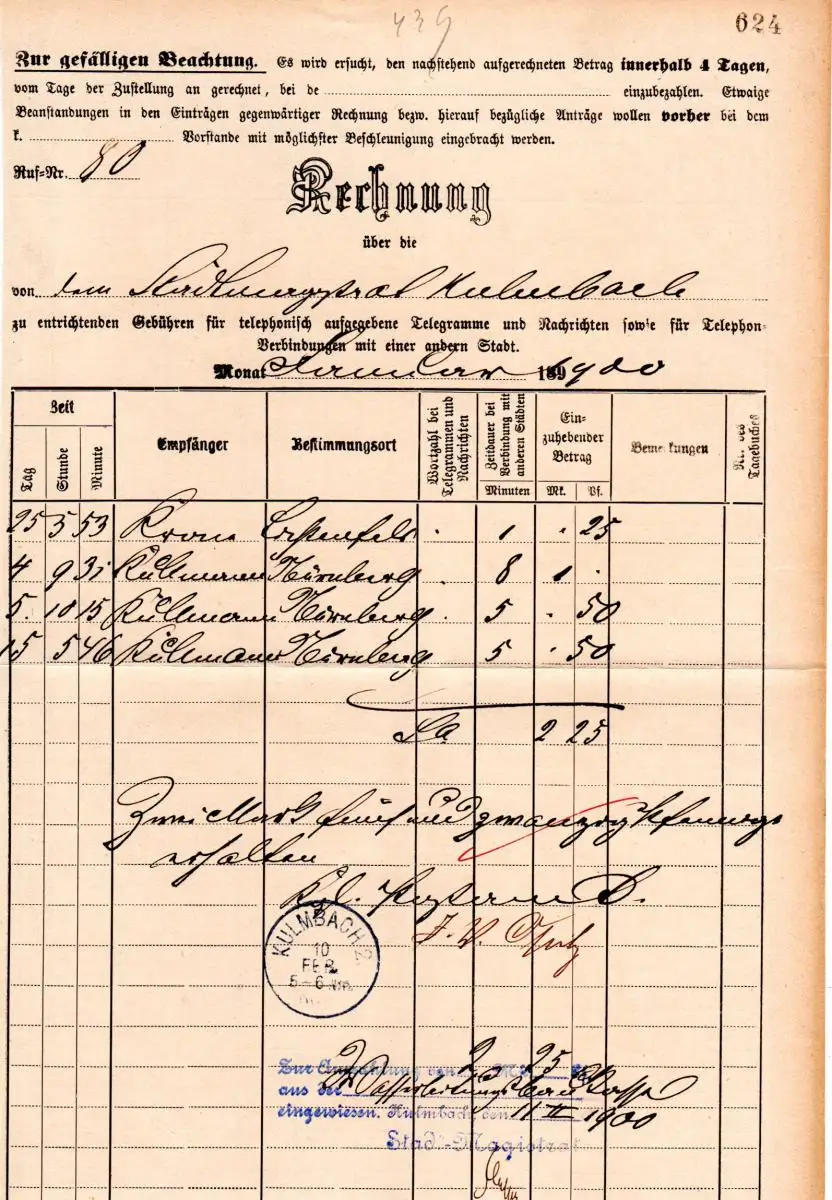 Bayern 1900, Rechnung Telegramm u.Telefongebühren, Postformular m. K1 Kulmbach 2