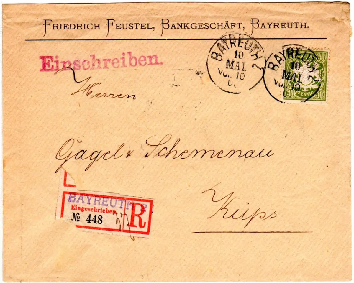 Bayern 1900, eingestempelter R-Zettel BAYREUTH 2 auf Firmen Rekobrief m. 30 Pf.