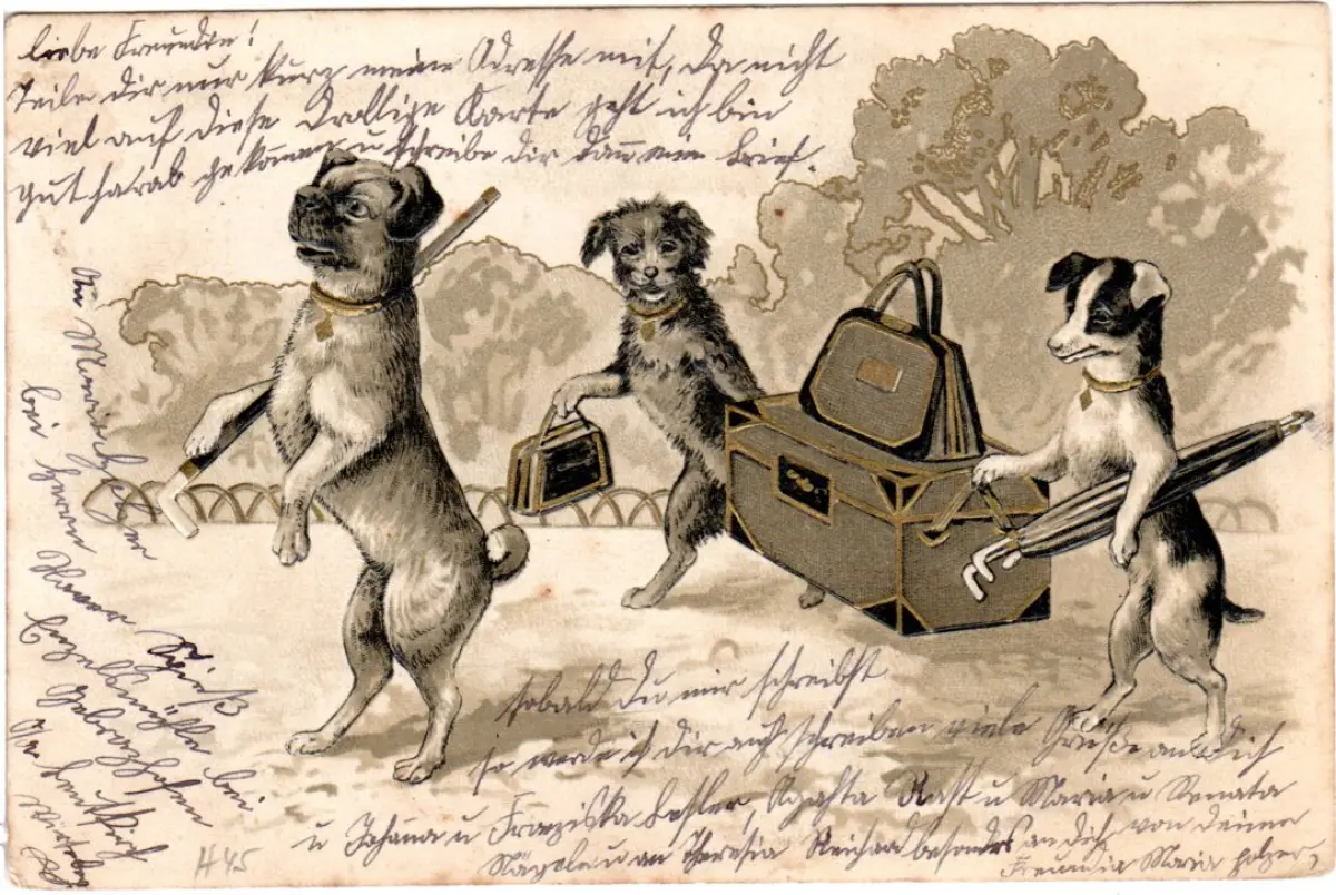 PHSt.-R3 Nellenbruck Taxe Wengen i. Schwaben als Ankunftstpl. auf Hunde Präge-AK m. Golddruck. Mit 5 Pf. Germania ab Leutkirch n. Nellenbruck bei Kleinweiler, Gemeinde Wengen. Schöne Prägekarte!