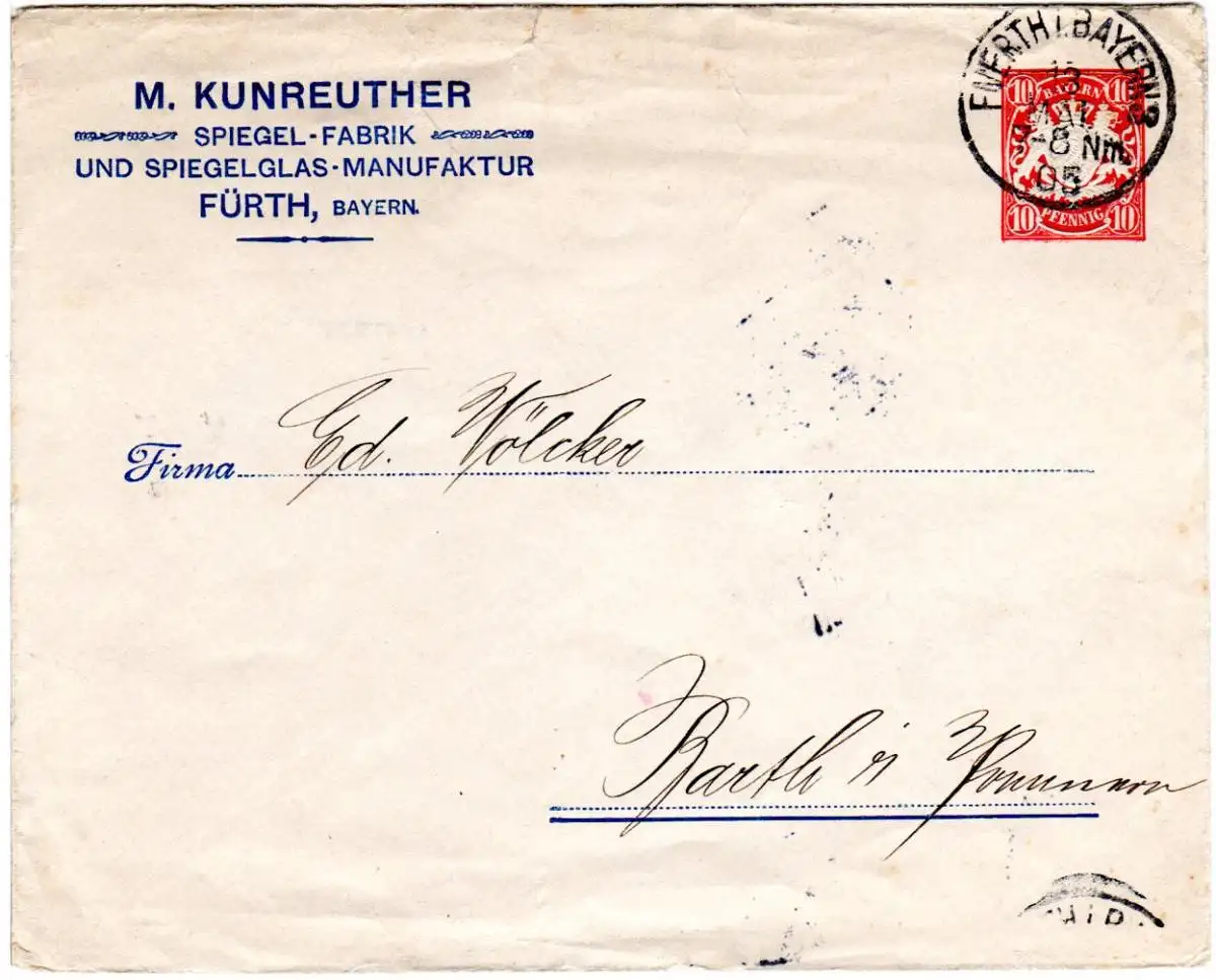 Von Fürth gebr. 10 Pf. Privatganzsachenumschlag M. Kunreuther, Spiegel-Fabrik und Spiegelglas-Manufaktur