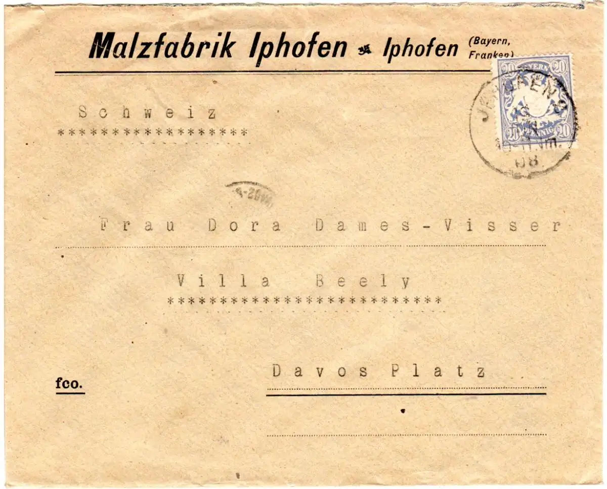 Bayern 1908, 20 Pf. auf Malzfabrik Firmenbrief v. Iphofen i.d. Schweiz