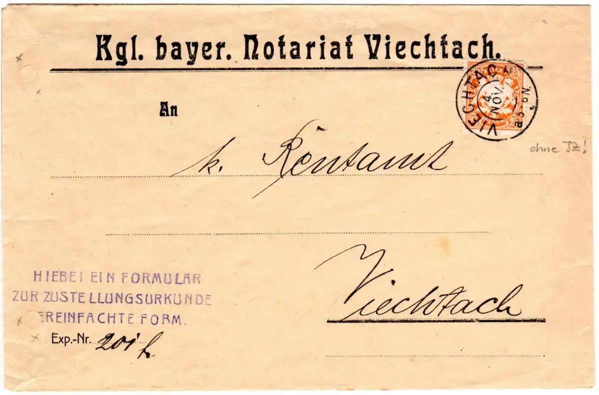 Bayern 1909, EF 25 Pf. auf Zustellungsurk. Orts-Brief m u. K2 VIECHTACH ohne JZ.
