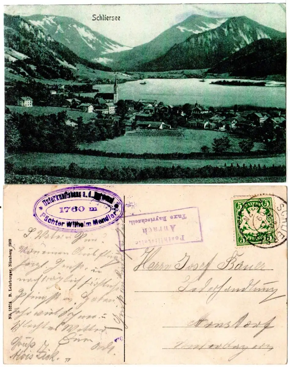 Bayern 1909, Posthilfstelle Aurach Taxe Bayrischzell auf Schliersee-Ak m. 5 Pf.