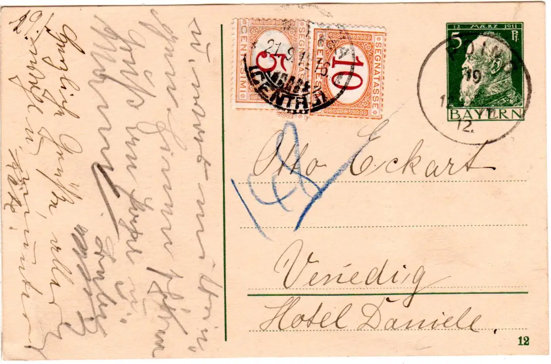Bayern 1912, 5 Pf. Ganzsache v. K1 POING n. Venedig m. Italien Porto 5+10 C.