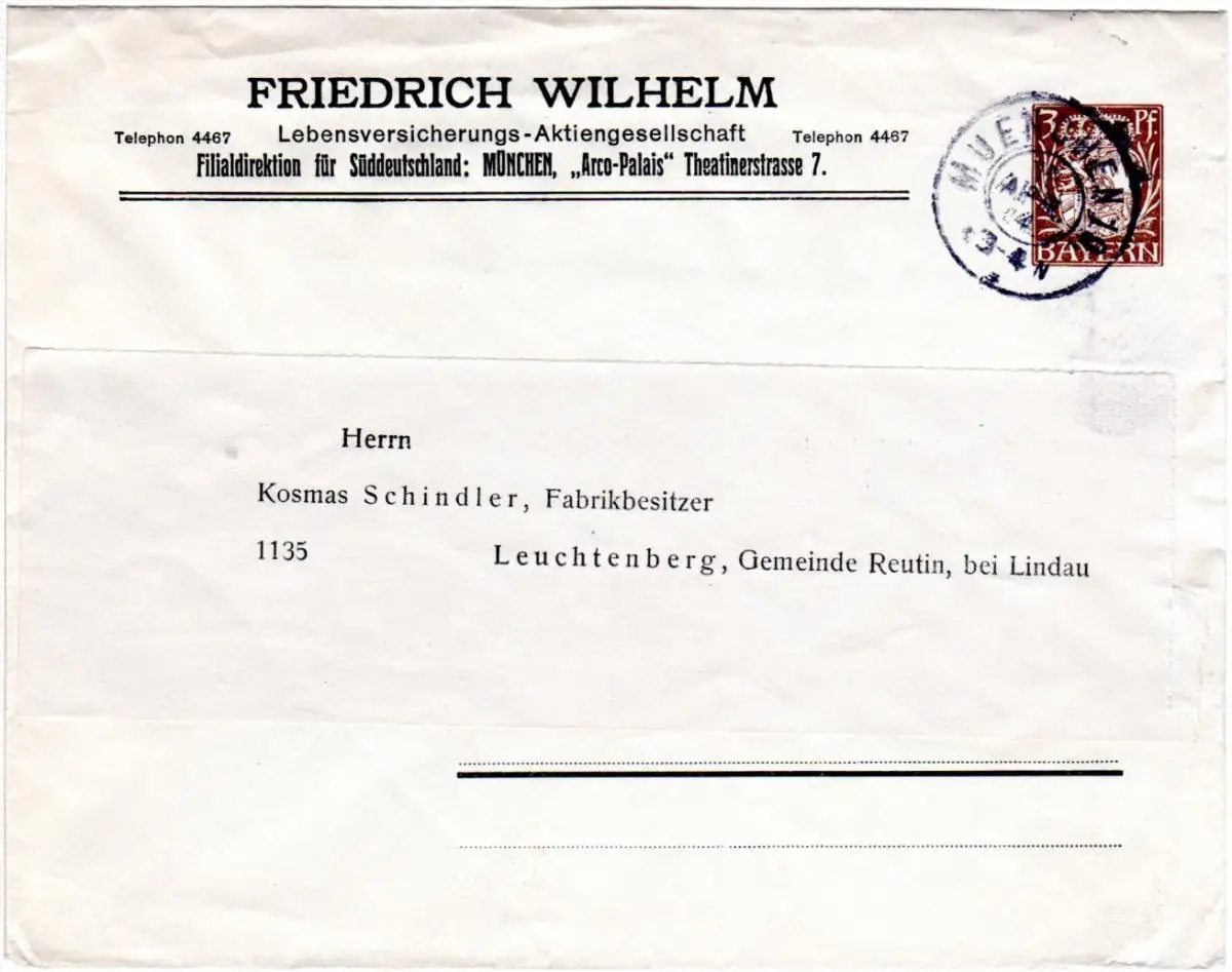 Privatganzsachenumschlag m. Zudruck Friedrich Wilhelm Lebensversicherungs-Aktiengesellschaft. Saubere, offen versendete Drucksachenverwendung n. Reutin b. Lindau.