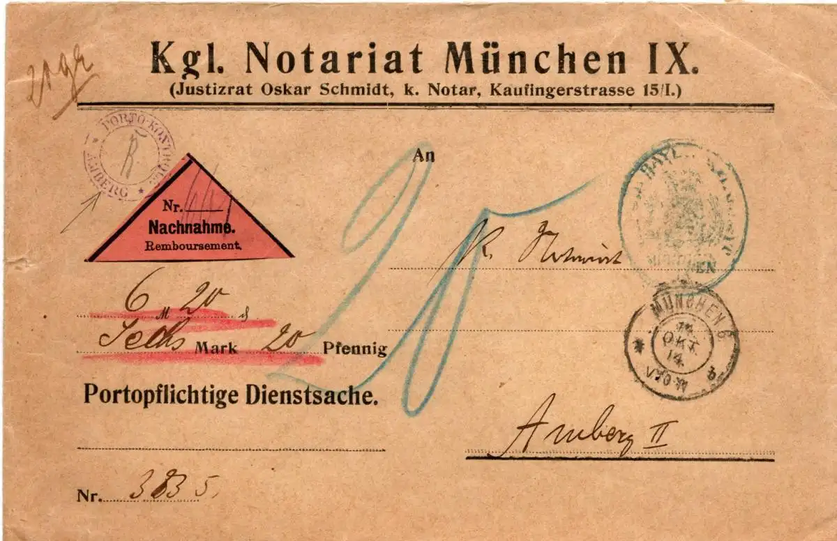 Bayern 1914, K2 PORTO-KONTROLLE AMBERG klar auf Dienstsache NN-Brief v. München