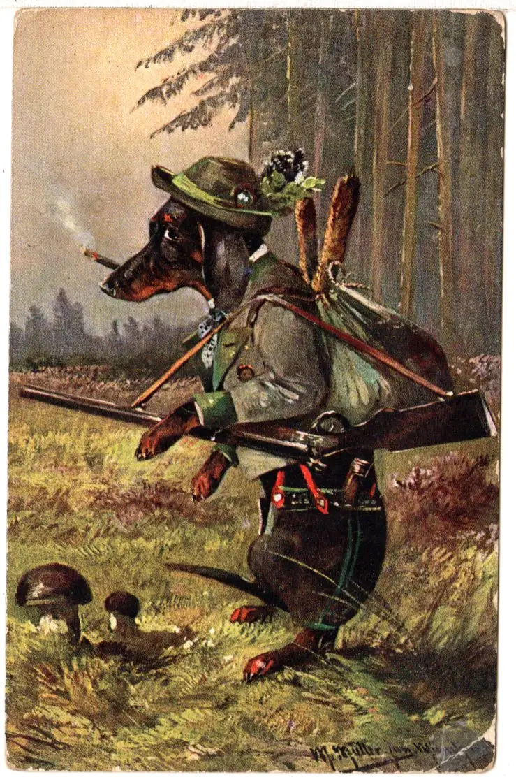 Als Jäger m. Gewehr u. Rucksack verkleideter Dackel Hund im Wald m. 2 Pilzen, Farb-AK m. kl. Eckmängeln. siehe scans. Entwertung K1 Feldkirchen b. München.
