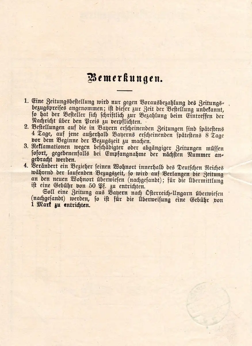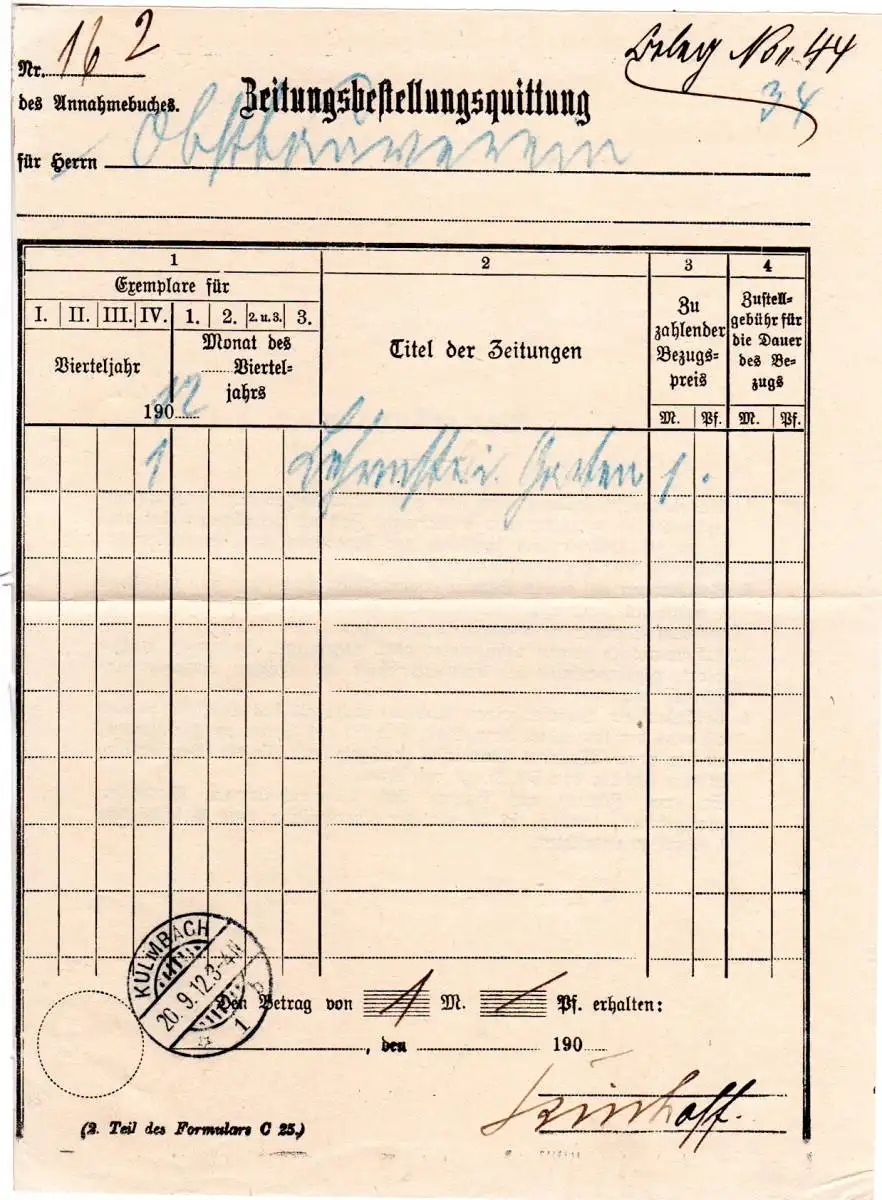 Bayern 1916, Postformular Zeitungsbestellungsquittung m. Stempel Kulmbach 1b