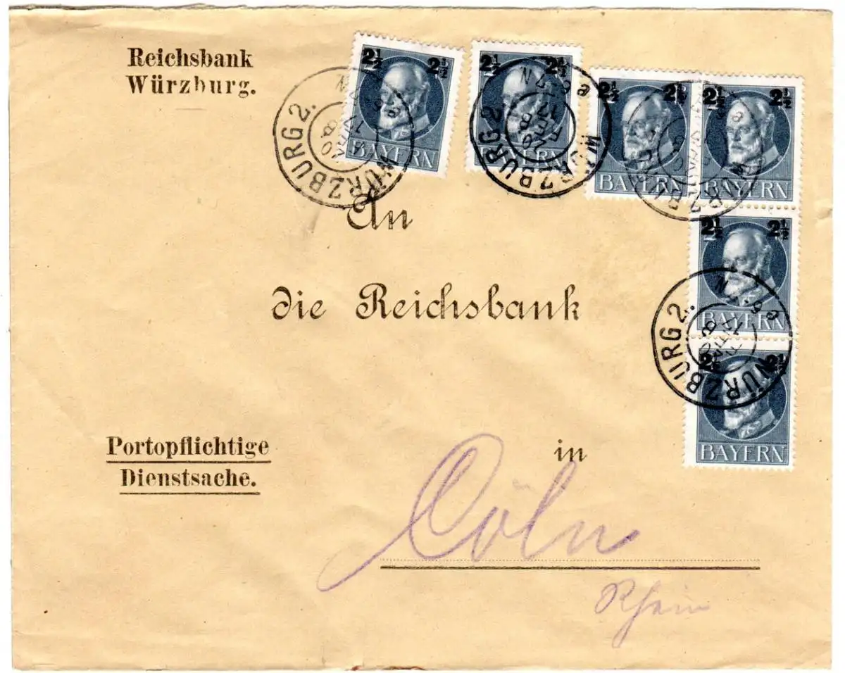 Bayern 1917, MeF 6x2 1/2 Pf. auf Reichsbank Brief v. Würzburg n. Köln.