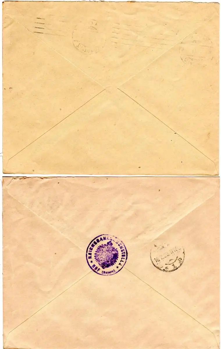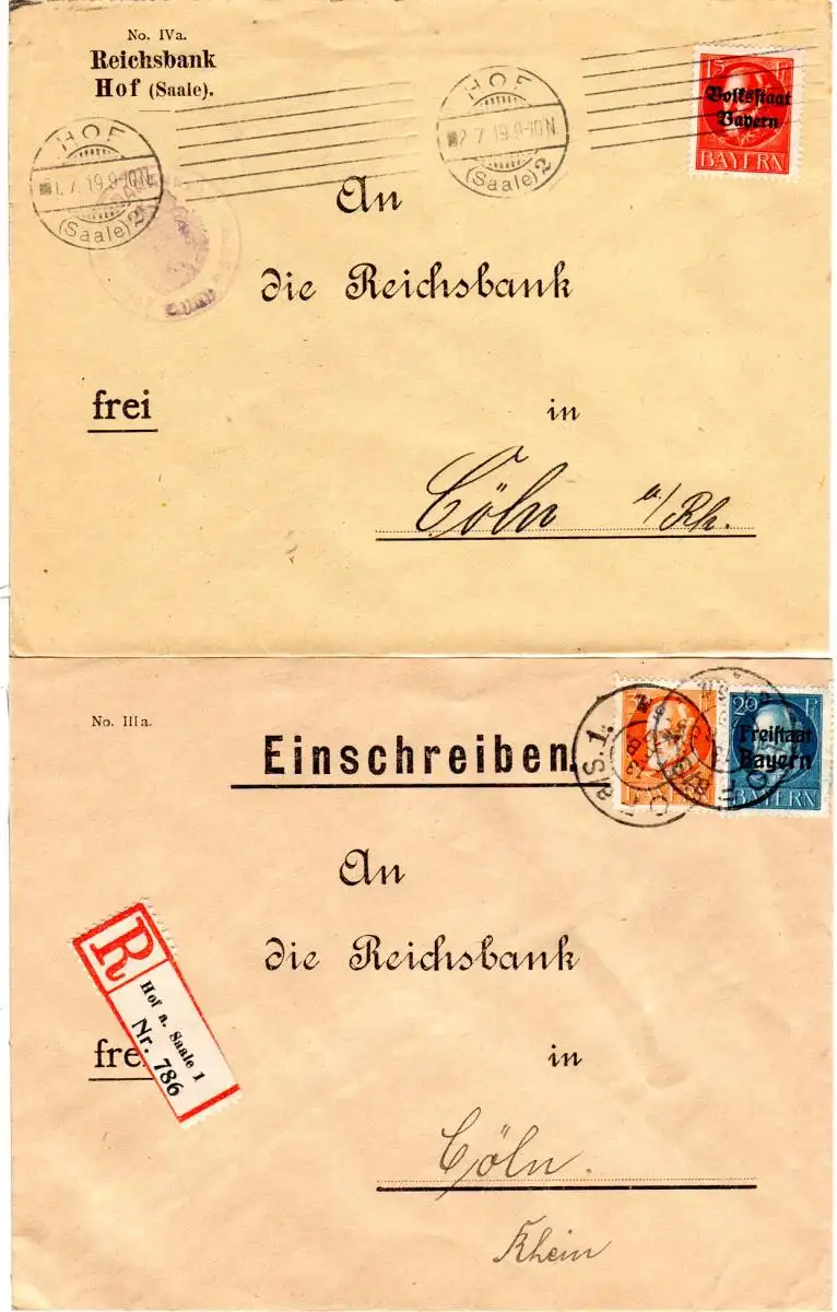 Bayern 1919/20, 2 Reichsbank Briefe v. Hof n. Köln dabei 1mal Einschreiben