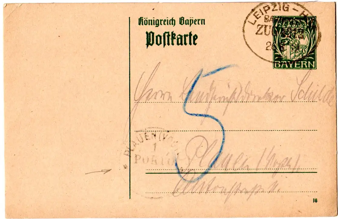 Unzureichend frankierte 7 1/2 Pf. Ganzsache (Postkarte im Fernverkehr kostete 10 Pf.) m. Bahnpoststempel LEIPZIG - HOF ZUG 212 26.8.19. Portostempel v. Plauen u. hds. "5" Pf. Nachgebühr.