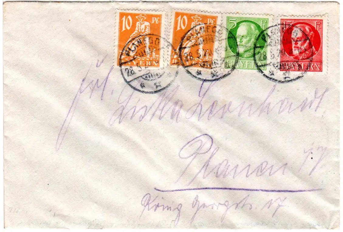 Bayern 1920, 2x10 Pf. Abschied+5+15 Pf. Ludwig Brief v. PLANEGG