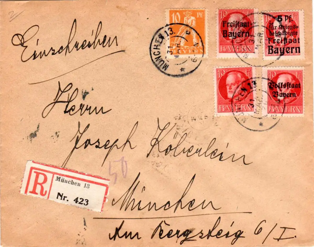 Bayern 1920, 5 Marken auf portorichtigem Orts-Einschreiben Brief v. München 13