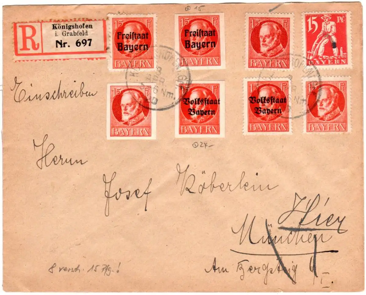 Bayern 1920, 8 versch. 15 Pf. Marken auf Reko-Brief v. Königshofen i.Grf.