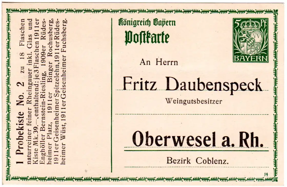Bayern, 5 Pf. Ganzsache m. Weingut Zudruck F. Daubenspeck Oberwesel