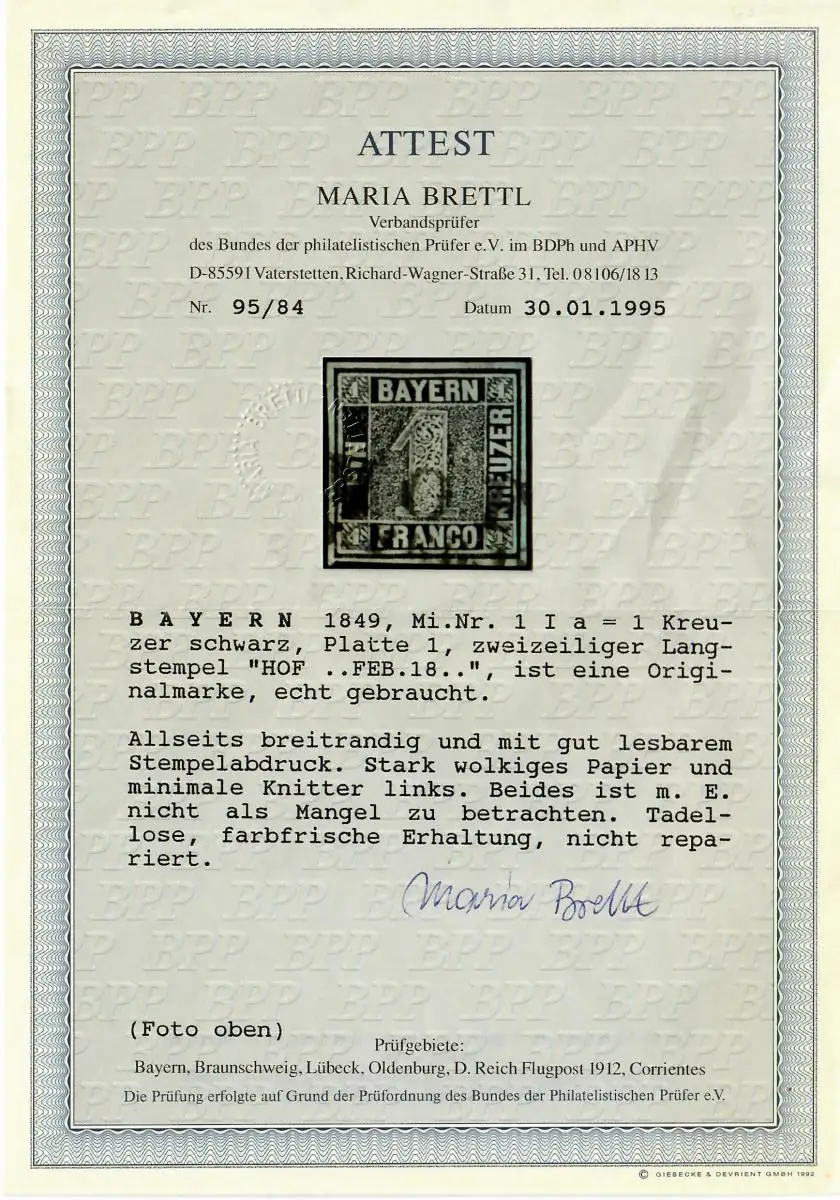 Bayern: MiNr. 1 I a, gestempelt Hof, BPP Attest