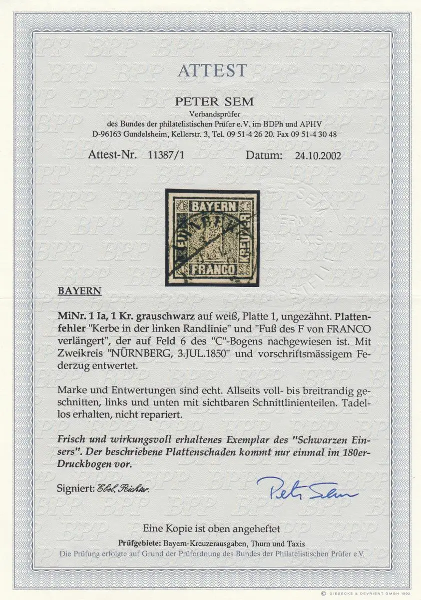 Bayern MiNr. 1 Ia, Platte 1, Plattenfehler, gestempelt Nürnberg, BPP Attest