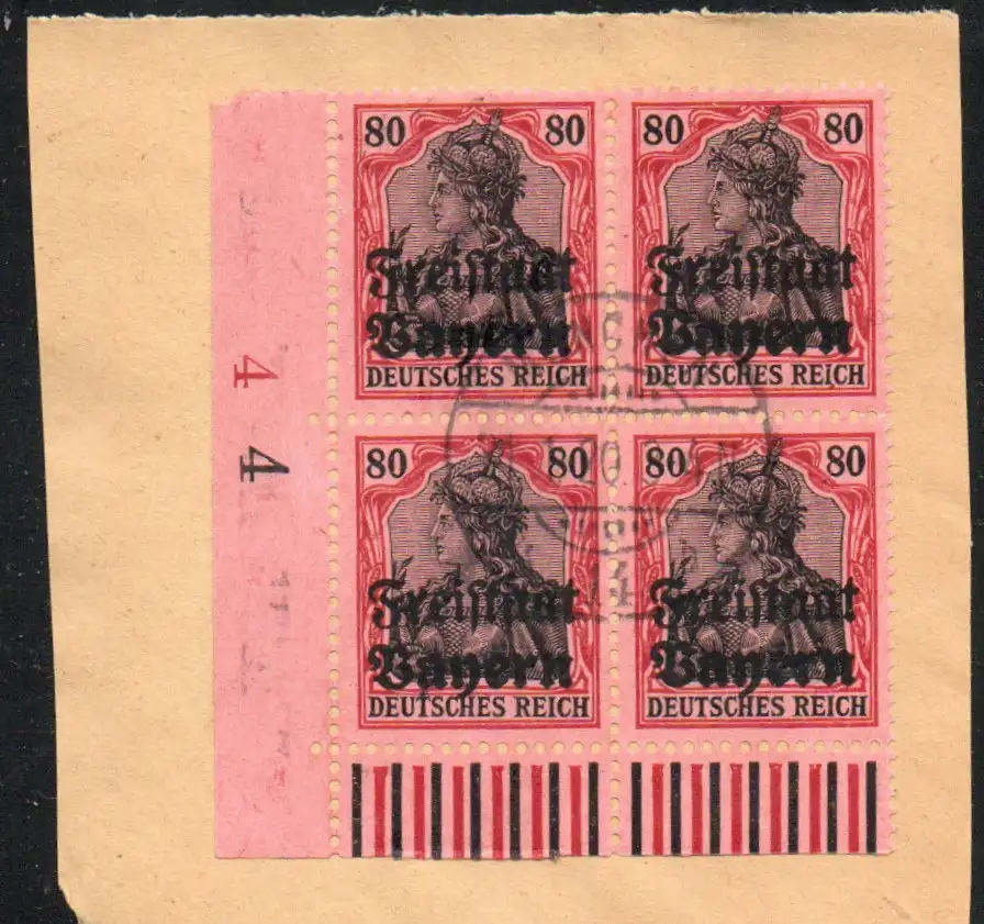 Bayern: MiNr. 147 WUR, Eckrand 4er Block VE3, gestempelt