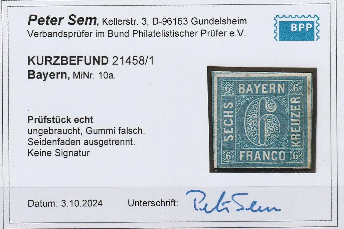 Bayern Nr. 10a (6 Kreuzer) ungebraucht. Befund Sem