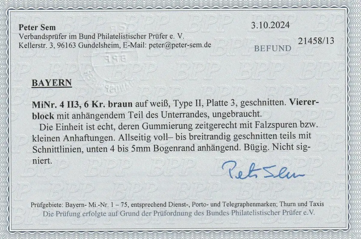 Bayern Nr. 4 im ungebrauchten Viererblock vom Unterrand, Befund Sem