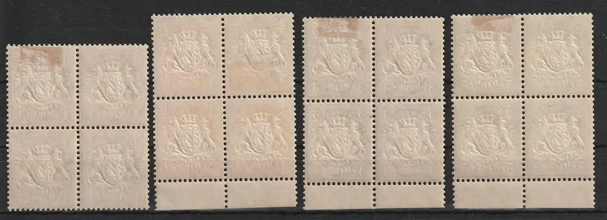Die Viererblocks haben jeweils auf 1 Marke einen Erstfalz, jeweils 3 Marken sind postfrisch. Die Erhaltung ist einwandfrei.