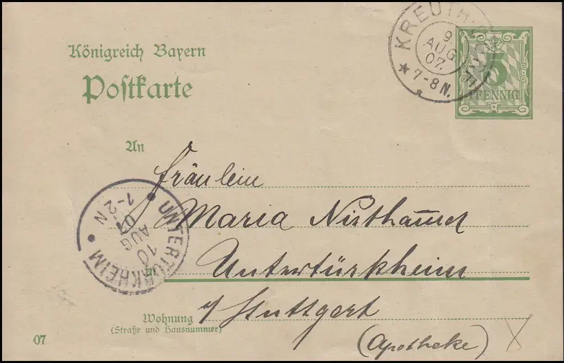 Bayern P 66/05 Ziffer 5 Pf grün DV 07, KREUTH-DORF 9.8.07 nach Untertürkheim