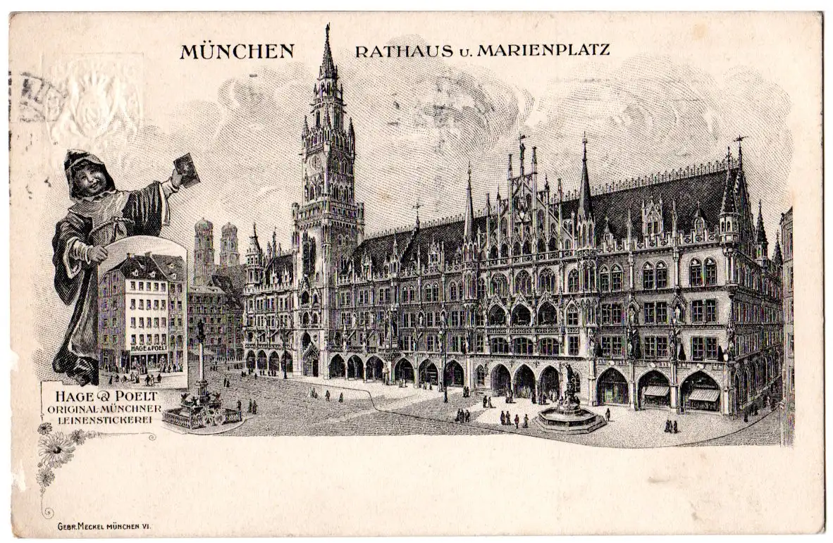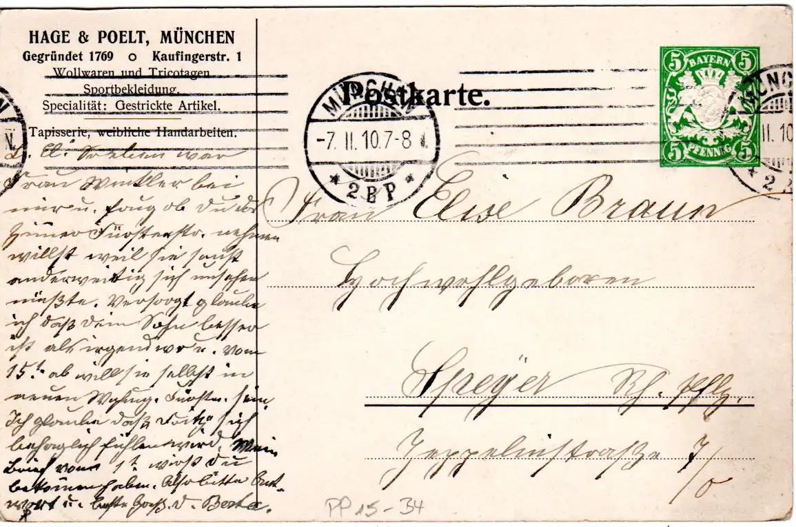 1910 nach Speyer gebr. Bayern 5 Pf. grün Wappen Privatpostkarte "Hage & Poelt Original Münchner Leinenstickerei - Wollwaren, Tricotagen, Sportbekleidung" mit rs. Abb. "Firmengebäude und Rathaus mit Marienplatz u. Münchner Kindl". Karte m. kl. Schürfspuren am linken bildseitigen Rand (siehe scans).