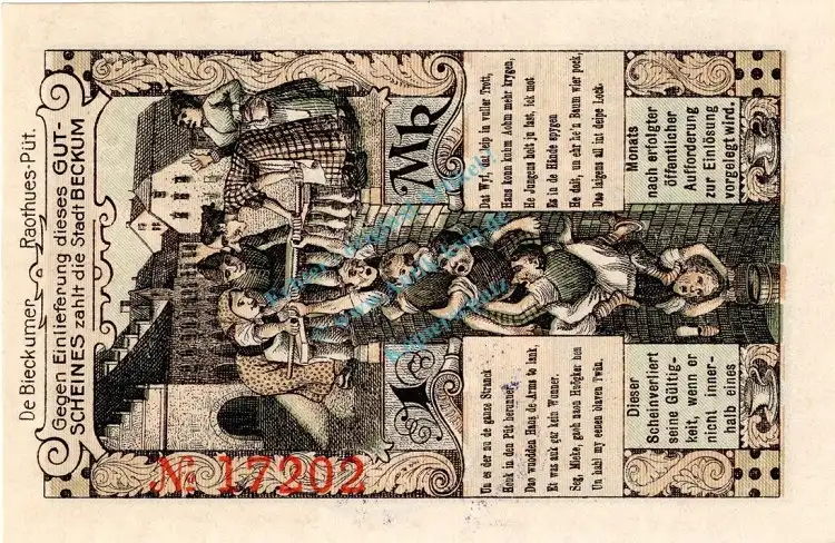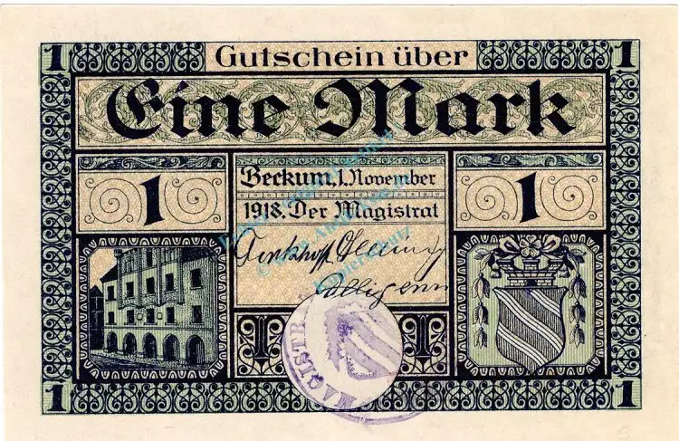 Beckum , Banknote 1 Mark Schein unc-kfr. Geiger 035.01.a , Westfalen 1918 Grossnotgeld