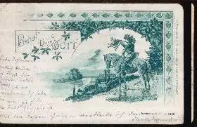 Behüf' Dich Gott - Gelaufen. 1898. Eckknick. (Trompeter, Ritter, Dame).