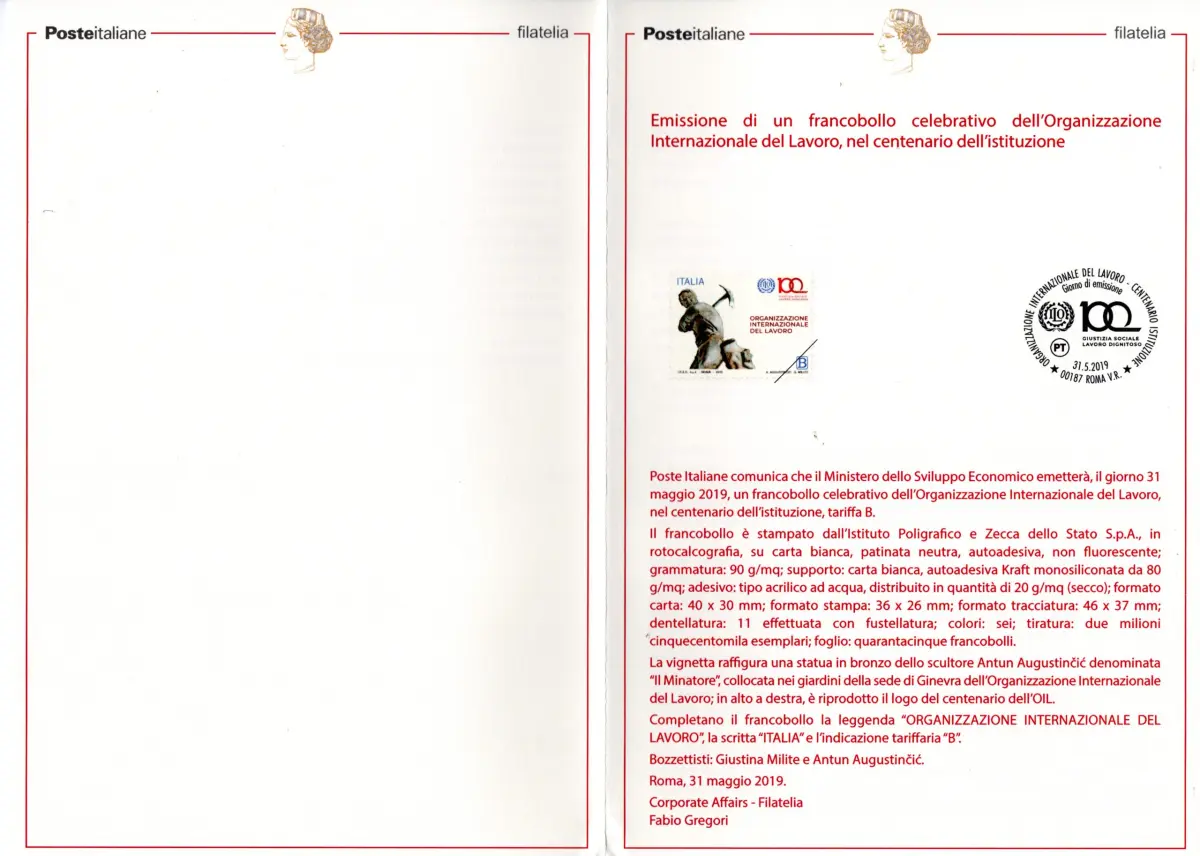 Illustratives Bulletin Gratisausgabe - OIL Illustratives Bulletin der Ausgabe Internationale Arbeitsorganisation OIL vom 31.5.19 - Auf dem Bulletin ist die Ausgabe und die Annullierung auf der Rückseite wiedergegeben KEIN PREIS, NUMMERIERUNG UND BARCODE FÜR DEN VERKAUF - GRATISAUSGABE - UNGEWÖHNLICH