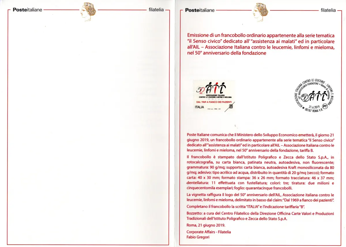 Illustratives Bulletin Geschenkausgabe - AIL Bulletin Illustrativo dell'emission Associazione Italiana contre le le leucemie del 21.6.19 - Auf dem Bulletin ist die Ausgabe und die Annullierung auf der Rückseite wiedergegeben NICHT DER PREIS, DIE NUMMERIERUNG UND DER BARCODE FÜR DEN VERKAUF VORHANDEN - GESCHENKAUSGABE - UNGEWÖHNLICH