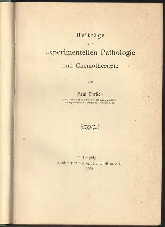 Bemerkungen: Garrison/Morton 2565 - Erstausgabe mit der Paul Ehrlich (1854-1915) seine Forschungsergebnisse zur Chemotherapie, als Aufsatzsammlung mit von ihm gehaltenen Vorträgen, publiziert. Im Vorwort schreibt er: "Äußere Umstände waren es meist, die mir die erfreuliche Gelegenheit gaben, vor einem größeren Hörerkreise in London, Amsterdam, Berlin und Stockholm über die Resultate meiner experimentellen Arbeiten, welche in den letzten Jahren hauptsächlich die experimentelle Erforschung der Geschwülste, sowie chemotherapeutische Untersuchungen betrafen, zu berichten." (Vorw.). Ehrlich hatte im Vorjahr zusammen mit Ilja Metschnikow den Medizin-Nobelpreis erhalten.