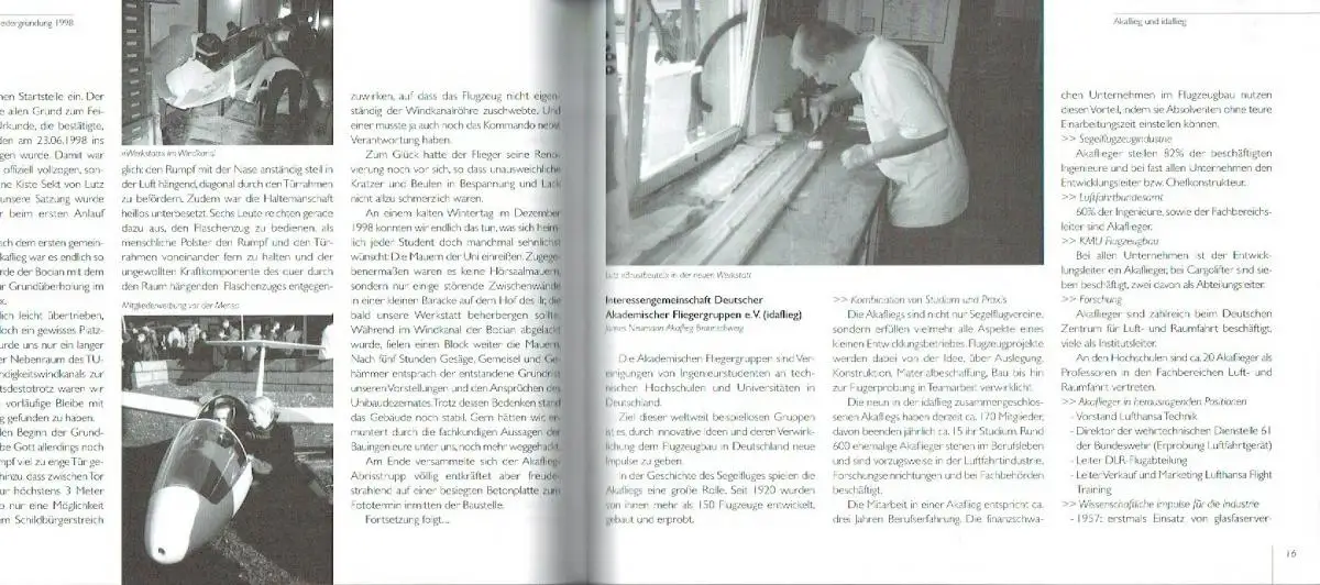 sehr guter Zustand, geringe Gebrauchs- und Alterungsspuren: nahezu neuwertig, Seit der Gründung der Akaflieg Dresden sind nun fast vier Jahre vergangen. Während dieser Zeit waren die aktiven Mitglieder mehr als ausgelastet mit der Grundüberholung von zweiFlugzeugen, vielen Reparaturen, der Beschaffung von Material, Geld und Werkzeugen und der Papierseite eines Vereins. Im letzten Jahr gelang es uns endlich, mit der Konzeption und Berechnung eines ersten eigenen Segelflugzeuges, der D-B 11 zu beginnen und damit unserem Ziel eine »echte« Akaflieg zu werden, näherzukommen. Es war also nie genug Zeit, alles Erlebte und Erreichte in einer Art Berichtsheft festzuhalten. Die vorliegende Broschüre soll das nun ändern. Da sie die Jahre 1998 bis 2001 umfasst, ist sie etwas umfangreicher. In Zukunft werden wir hoffentlich die Zeit finden, jährlich ein solches Berichtsheft herauszugeben. Es soll Freunden und Sponsoren der Akaflieg einen kleinen Überblick über unsere Arbeit geben, kartoniert, ca. 24,5 x 19, 34 Seiten mit zahlreichen Bildern