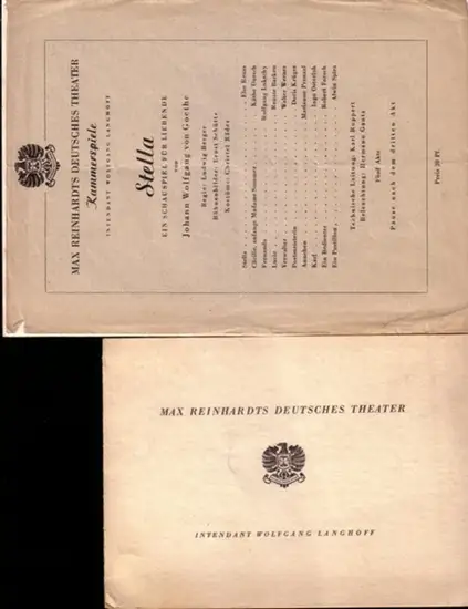 Programmzettel des Deutschen Theaters und der Kammerspiele. 1947, Konvolut aus 4 Zetteln. Aus dem Inhalt: Blätter: Einladung zur ERSTAUFFÜHRUNG "Der Marquis von Keith" von Frank Wedekind. Insz.: Gustaf Gründgens, mit ua.: Gustaf Gründgens, Gudrun Genest, Lola Müthel, Ernst Sattler, Angelika Hurwicz, Peer Schmidt, Ernst Stahl-Nachbaur, Erich Dunskus. // "Stella" von J. W. v. Goethe. Insz.: Ludwig Berger, mit u.a.: Else Reuss, Käthe Dorsch, Wolfgang Lukschy, Walter Werner, Renate Barken. // "Die Hose" von Carl Sternheim. Insz.: Willi Schmidt, mit u.a.: Aribert Wäscher, Antje Weisgerber, Alice Treff, Hannsgeorg Laubenthal, Friedrich Maurer. // "Der Hauptmann von Köpenick" von Carl Zuckmayer. Insz.: Ernst Legal, mit u.a.: Paul Bildt, Herwart Grosse, Herbert Richter, Gerhart Bienert, Ernst Sattler, Harry Hindemith, Traute Bendach