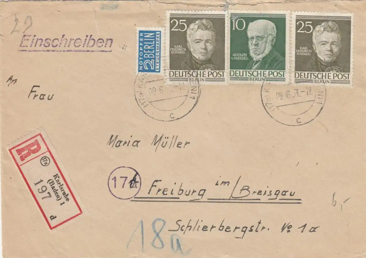Berlin: Einschreiben aus Karlsruhe nach Freibug 1954