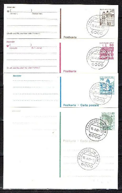 Berlin Ganzsache, 4 Postkarten "Burgen + Schlösser" gestempelt.