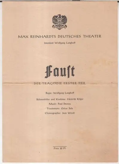Berlin, Max Reinhardts Deutsches Theater. - Intendanz und Regie: Wolfgang Langhoff: Programmheft zu: Faust. Der Tragödie erster Teil. - Bühnenbilder und Kostüme: Heinrich Kilger. - Musik: Paul Dessau. - Trautonium: Oskar Sala. - Choreographie: Jean Weidt.