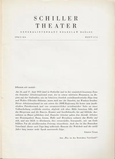 Berlin Schiller Theater. - Boleslaw Barlog (Intendanz). - Günter Grass: Die Plebejer proben den Aufstand. Programmheft der Spielzeit 1965 - 1966, Heft 174. URAUFFÜHRUNG von Günter Grass ! Inszenierung: Hansjörg Utzerath, mit u. a.: Rolf Henniger, Friedric