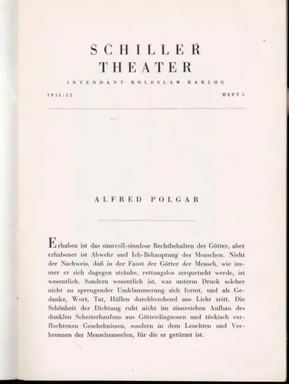 Berlin. - Schillertheater. - Boleslaw Barlog (Intendanz). - Sophokles: König Ödipus. Programmheft 5, Spielzeit 1951 / 1952. Übersetzt von Hugo von Hofmannsthal. Inszenierung und Bühne: Willi Schmidt, mit u. a.: Ernst Deutsch, Roma Bahn, Paul Wagner, Till