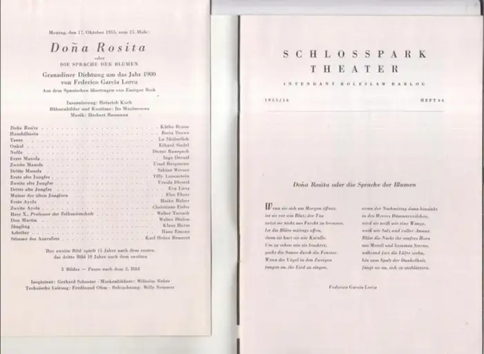 Berlin, Schlosspark-Theater. - Intendant: Boleslaw Barlog. - Federico Garcia Lorca: Programmheft zu: Dona Rosita oder Die Sprache der Blumen. Spielzeit 1955 / 1956, Heft 44. Granadiner Dichtung um das Jahr 1900 von Federico Garcia Lorca. - Inszenierung: H