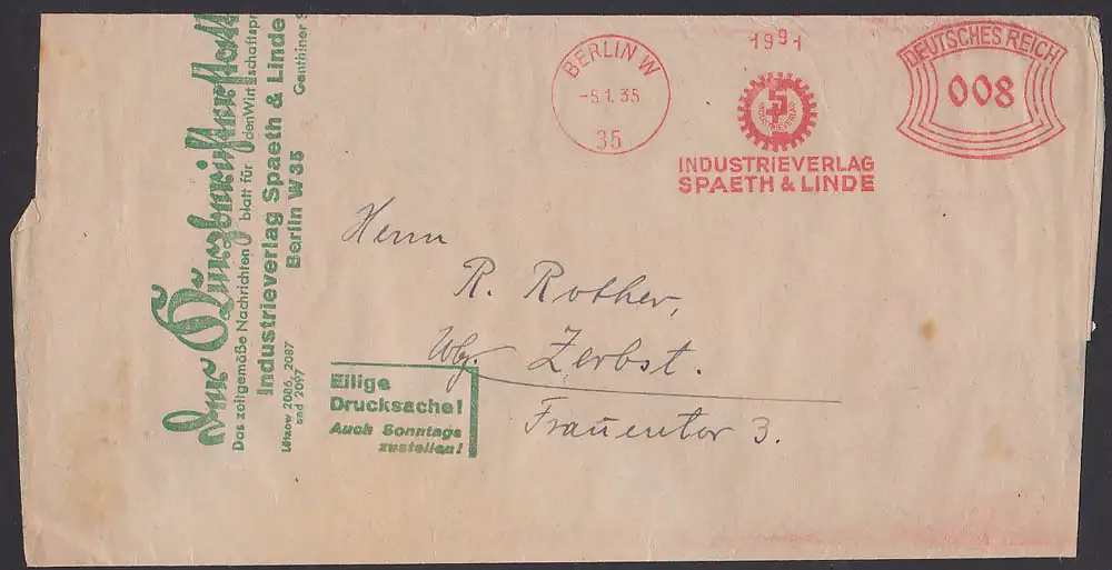 Berlin W 35 AFS auf Streifbandsendung Industrieverlag Spaeth & Linde 5.1.35