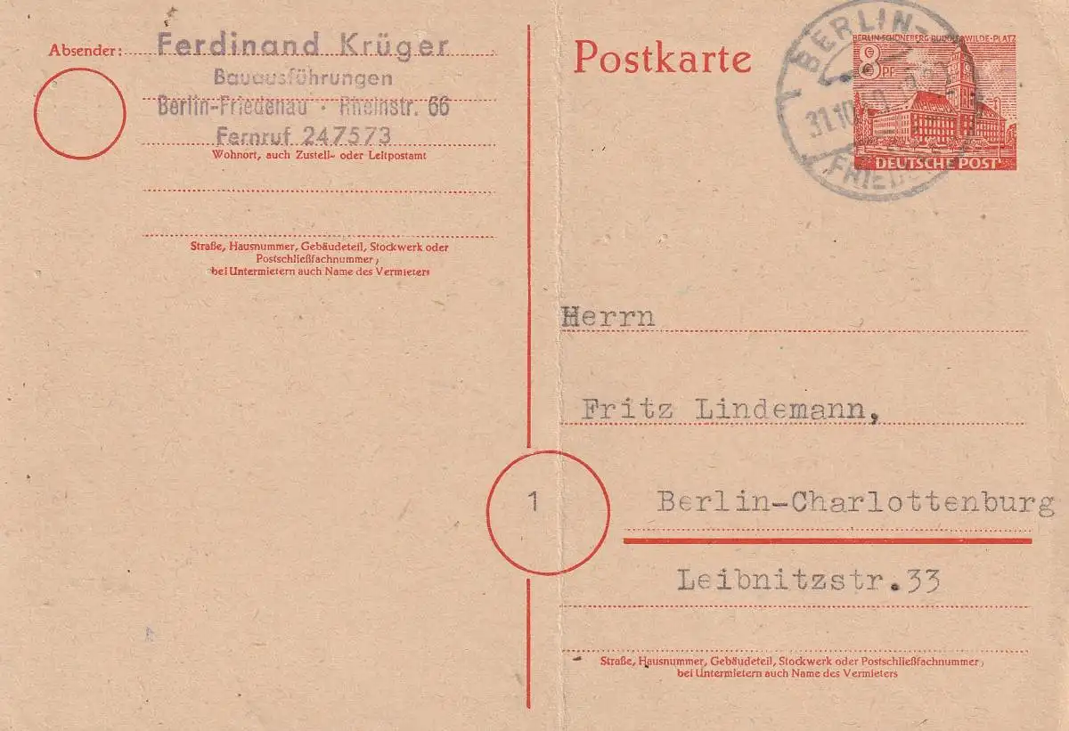 BERLIN - 1949, Ganzsache P 4b o, Mitteldruckstelle