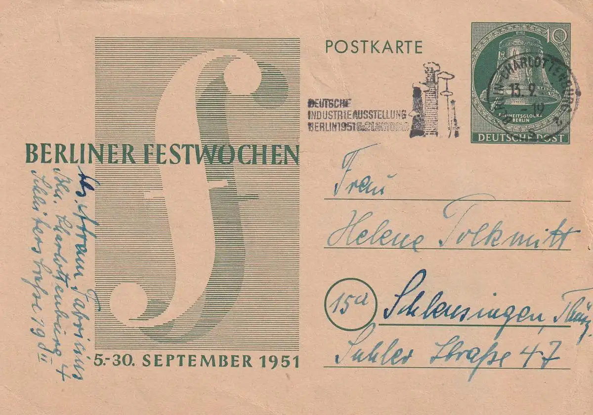 BERLIN - 1951, Ganzsache P 26 o Berliner Festwochen, 13.9.51