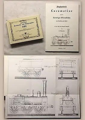 Berliner Eisenbahn- und Telegraphen-ABC (nach der Ausgabe von 1854) + Rebenstein: Stephanon's Locomotive auf der Ludwigs-Eisenbahn von Nürnberg nach Fürth (nach der Ausgabe von 1836) - Mit zwei Illustrationen auf einer mehrfach gefalteten Tafel. Sprache: deutsch Größe: quer 12° (ca. 13 cm x 9 cm) + 8° (ca. 19 cm x 13 cm) Kollation/ Einband: zusammen 132 S.; Pappband + Broschur Zustand: Einbände leicht berieben und bestoßen. Papierbedingt minimal gebräunt. Insgesamt sehr gute Exemplare.