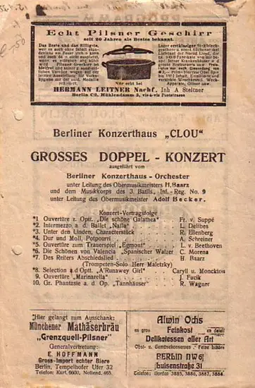 Berliner Konzerthaus Clou. - Direktion: Hoffmann & Retschlag. - H. Baarz: Programmzettel zu: Doppel - Konzert ausgeführt vom Berliner Konzerthaus - Orchester unter Leitung von H. Baarz und dem Musikkorps des 3. Batlls., Inf.-Reg. No.9 unter Leitung von