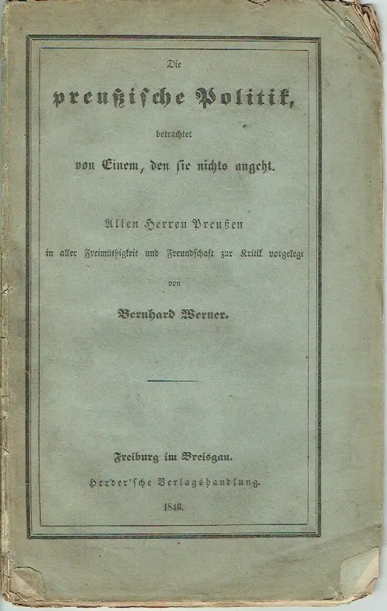 Bernhard Werner: Die preußische Politik, betrachtet von Einem, den sie nichts angeht Allen Herren Preußen in aller Freimüthigkeit und Freundschaft zur Kritik vorgelegt.