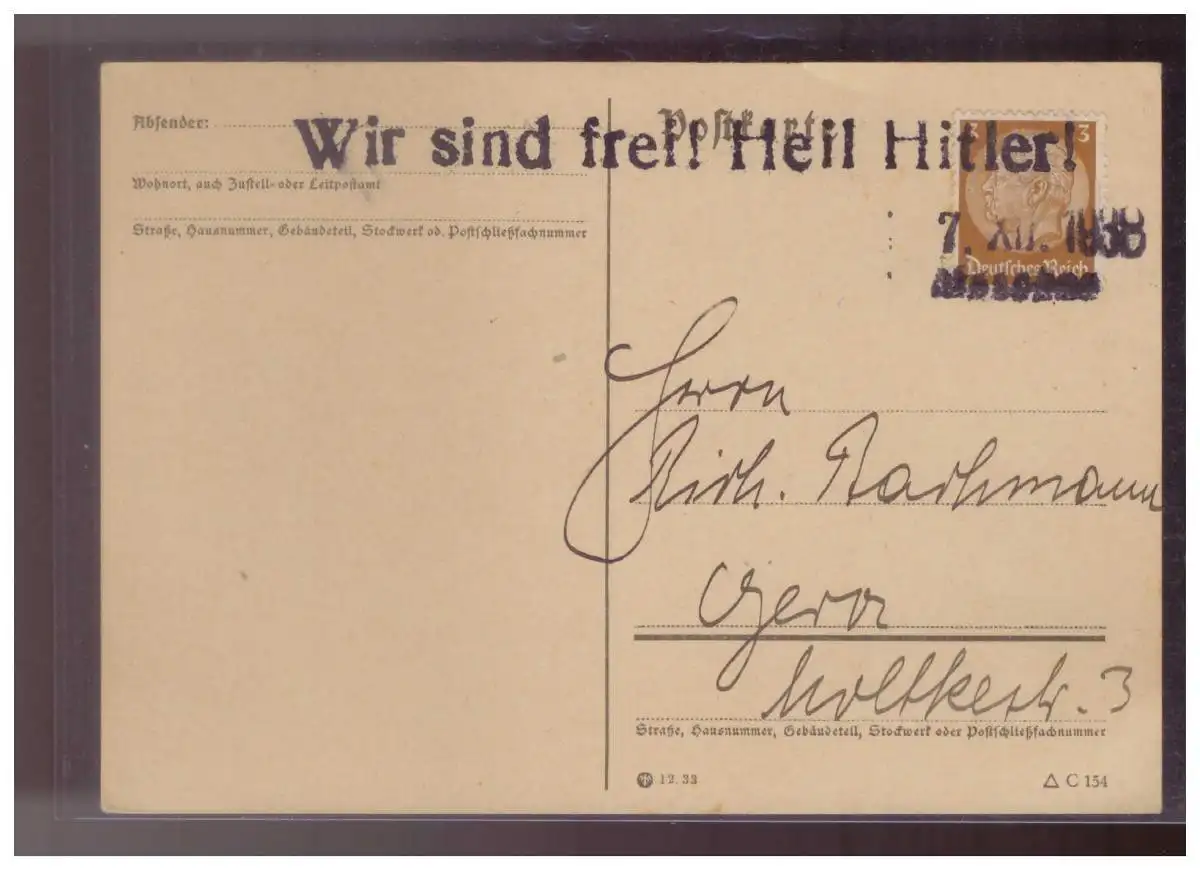 Sudetenland (024543) Propagandastempel auf Postkarte Wir sind frei! Heil Hitler! 7.12.1938 Moschau