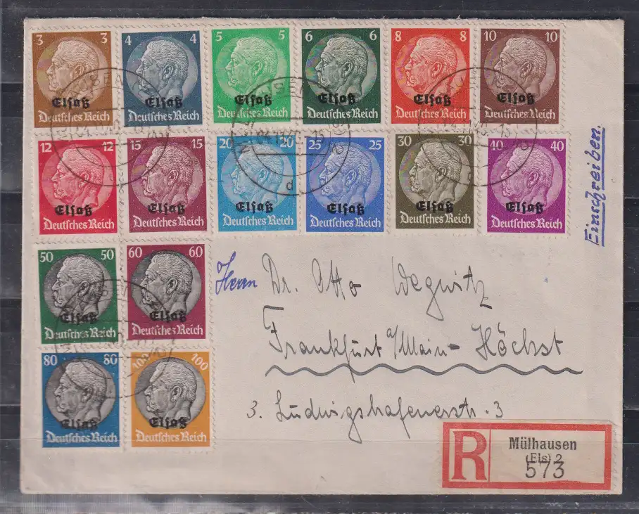 II.WK Elsaß gelaufener R-Satzbrief Mühlhausen 1940 nach Frankfurt/M. mit MiNo. 1/16 , rs.Ak-o