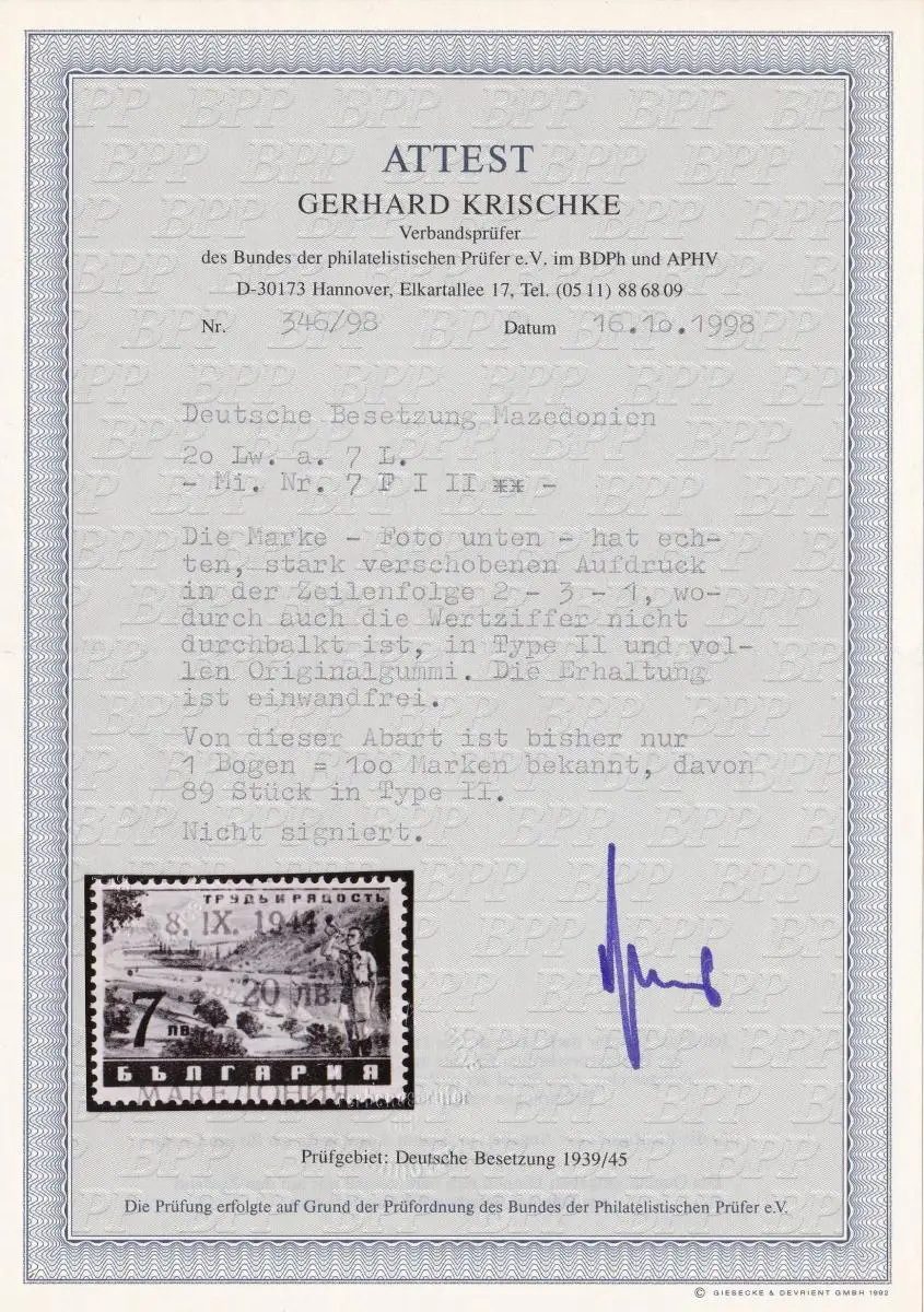 Bes. II. WK: Mazedonien: MiNr. 7 F I/II, **, BPP Attest Krischke