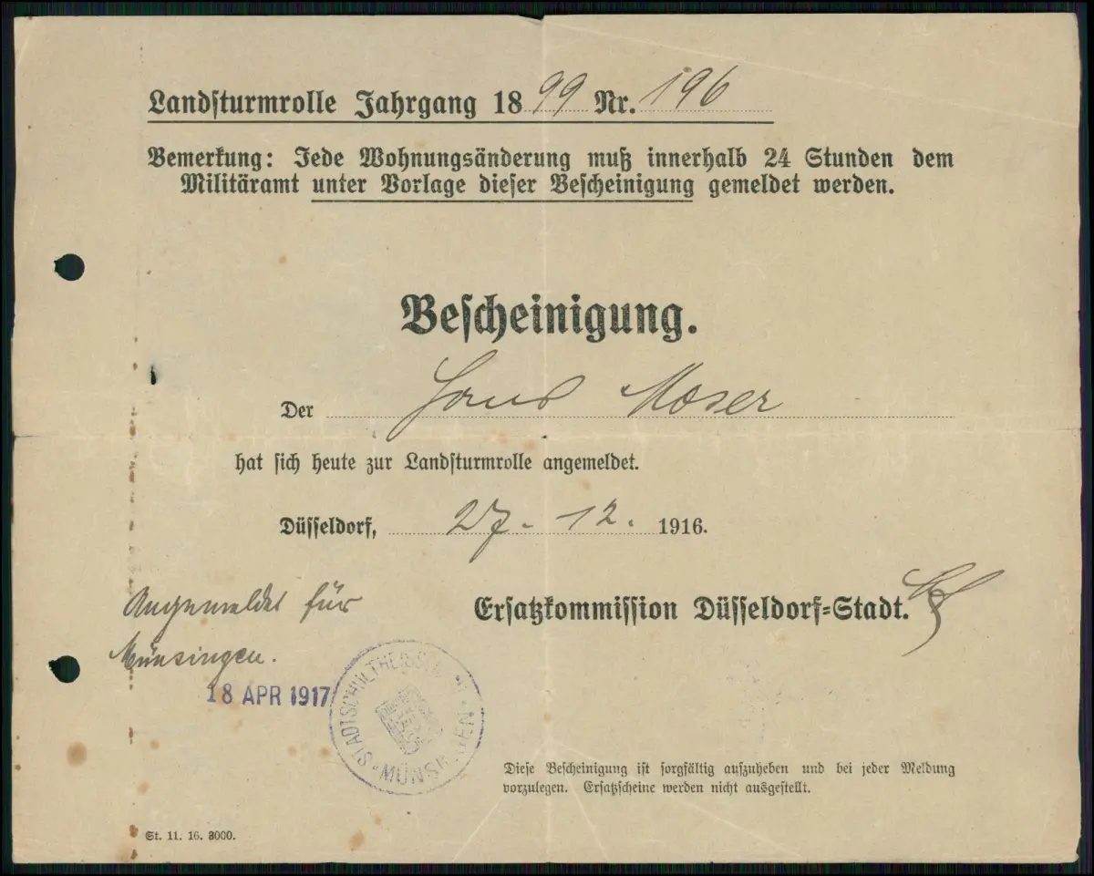 Bescheinigung 1. WK Landsturmrolle 1899 - Düsseldorf Ersatzkommission 1916-17
